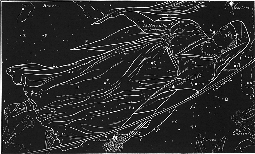 * A Latin translation of his work is in the British Museum Library. He says the Persians understood these signs, but that the Indians perverted them with inventions.But this picture is not found in any of the modern maps of the stars. There we find today a woman's wig! It appears that BERENICE, the wife of EUERGETES (PTOLEMY III), king of Egypt in the third century BC, when her husband once went on a dangerous expedition, vowed to consecrate her fine head of hair to Venus if he returned in safety. Her hair, which was hung up in the Temple of Venus, was subsequently stolen, and to comfort BERENICE, CONON, an astronomer of Alexandria (BC 283-222), gave it out that Jupiter had taken it and made it a constellation!** The constellations are called Decans. The word means a part, and is used of the three parts into which each sign is divided, each of which is occupied by a constellation.