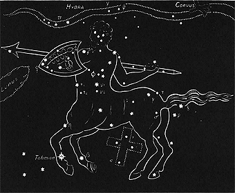 The Greek name was Cheiron, which means the pierced, or who pierces. In the Greek fables Cheiron was renowned for his skill in hunting, medicine, music, athletics, and prophecy. All the most distinguished heroes of Greece are described as his pupils. He was supposed to be immortal, but he voluntarily agreed to die; and, wounded by a poisoned arrow (not intended for him) while in conflict with a wild boar, he transferred his immortality to Prometheus; whereupon he was placed amongst the stars.